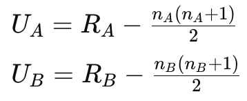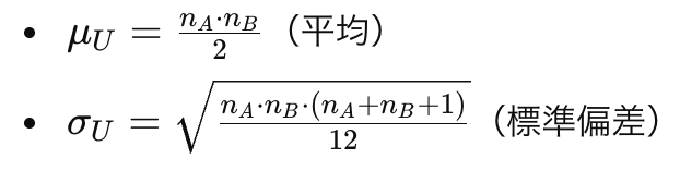 = (U値 – (nA * nB / 2)) / SQRT(nA * nB * (nA + nB + 1) / 12)