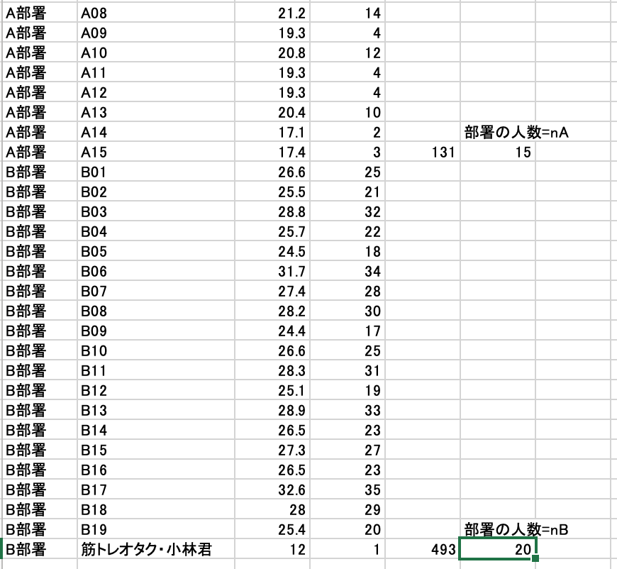 部署ごとの人数(n)を用意します。ここでは便宜上、A部署の人数をnA、B部署の人数をnBとします。