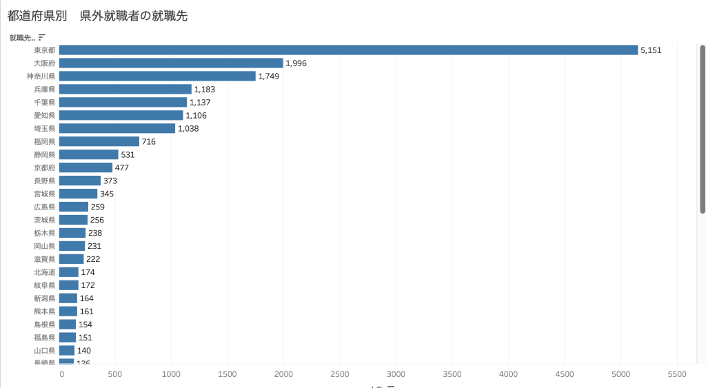 今回は棒グラフにしましたが、今度はワンクリックで県外大学の看護学生が入職した数が多い都道府県毎に並べ替えます。