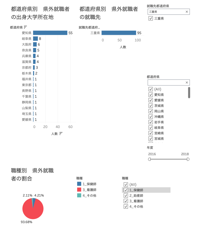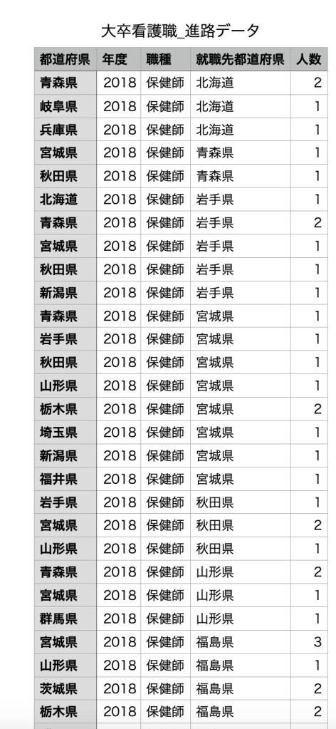このデータでは、2016年度〜2018年度に大学を卒業した看護学生が、①大学の所在都道府県とは別の都道府県で就職した人数、②大学所在地の県外で就職した学生の就職先都道府県を示しています。