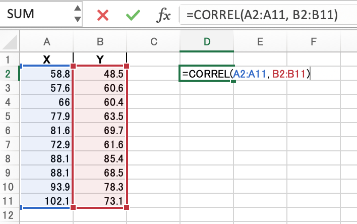=CORREL(比較したいデータAがある範囲,比較したいデータBがある範囲)を入力するだけです!