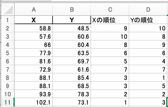 (例えば、C列に「Xの順位」、D列に「Yの順位」)