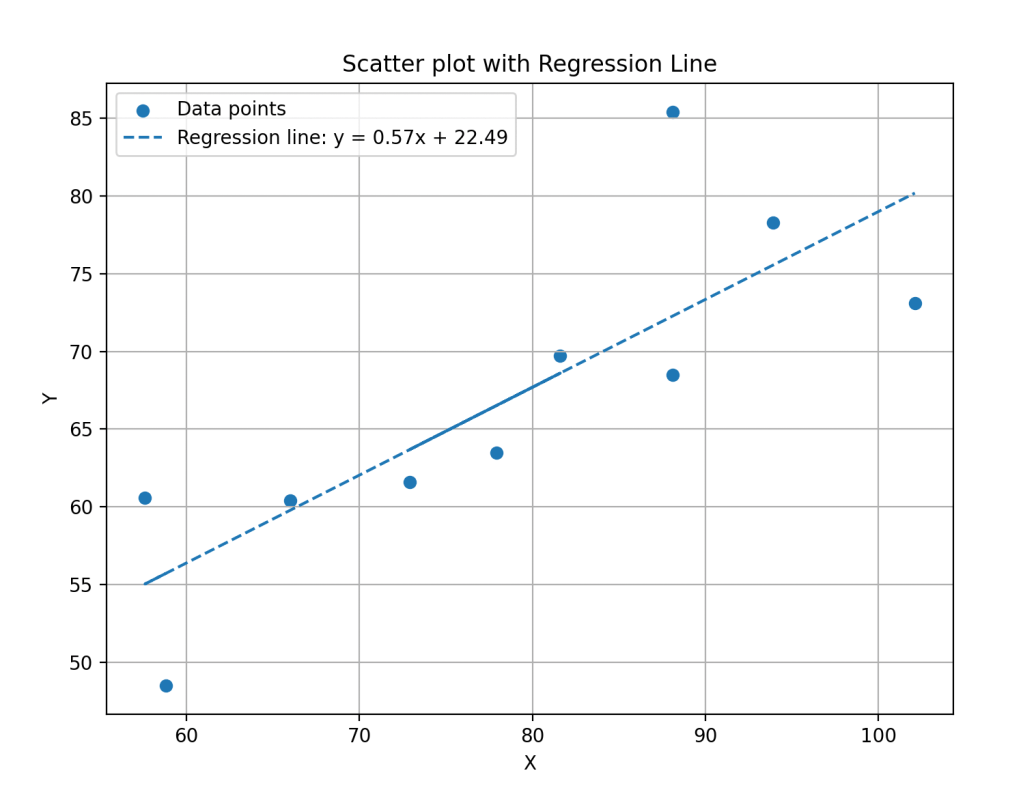 plt.plot(x, line, label=f'Regression line: y = {slope:.2f}x + {intercept:.2f}', linestyle='--')