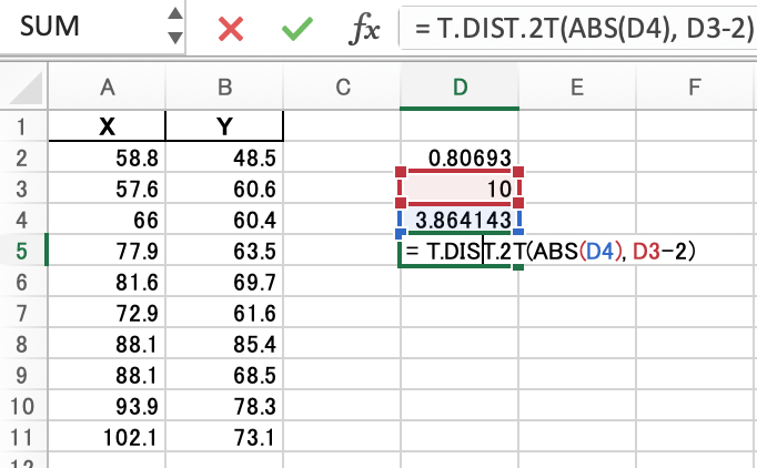 そして、= (相関係数セル * SQRT(データのペア数セル-2)) / SQRT(1 – 相関係数セル^2)でt値を求めます。