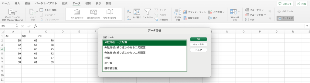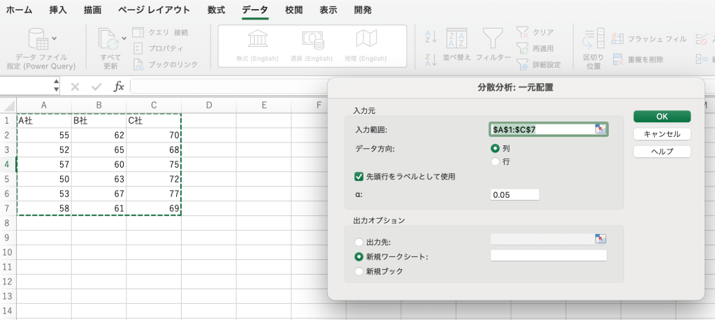 まず、「データ」タブ→「データ分析」→「分散分析:一元配置」を選択してください。