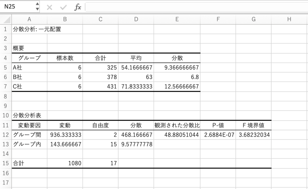 | F境界値 | 3.68 | 「このくらいF値が大きければ、有意差ありと認めましょう!」という基準。 今回は明らかにF値>F境界値ですから有意差はあると考えられます。 |