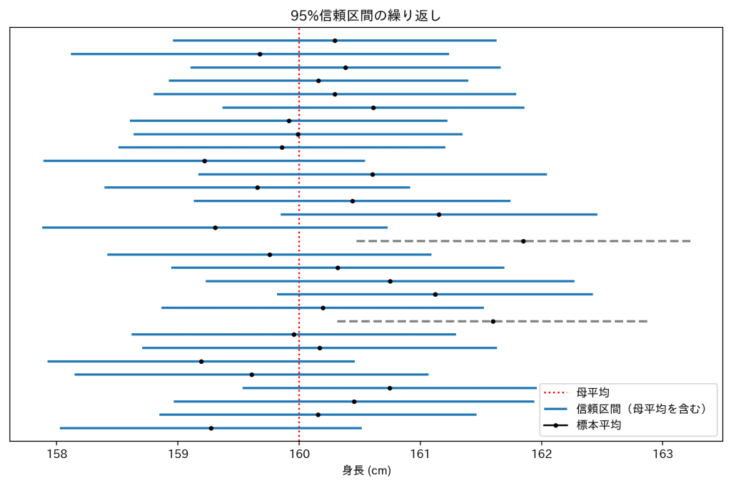 たとえば「村の平均身長は95%の確率で158〜162cmの間にある」というのではなく、