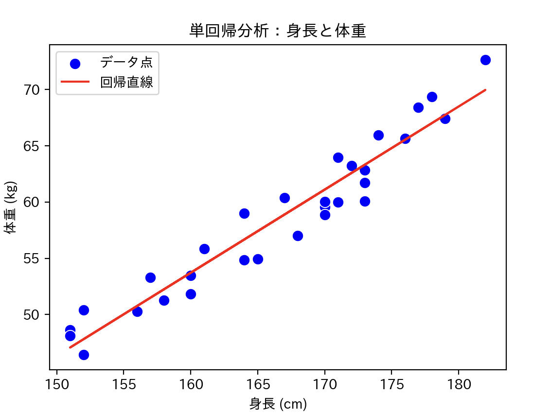 仮に結果が「身長が1cm高いと体重が0.7kg増える」なら、それが単回帰分析の成果です。