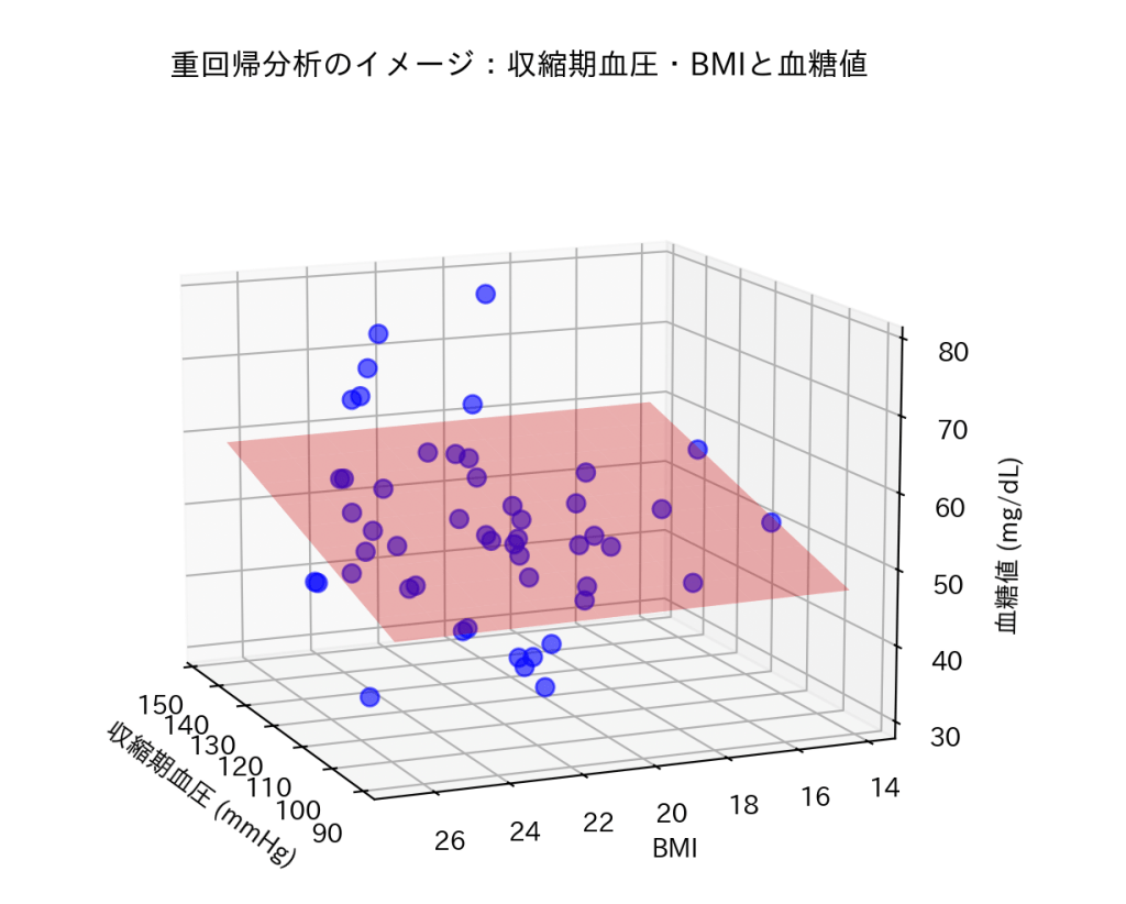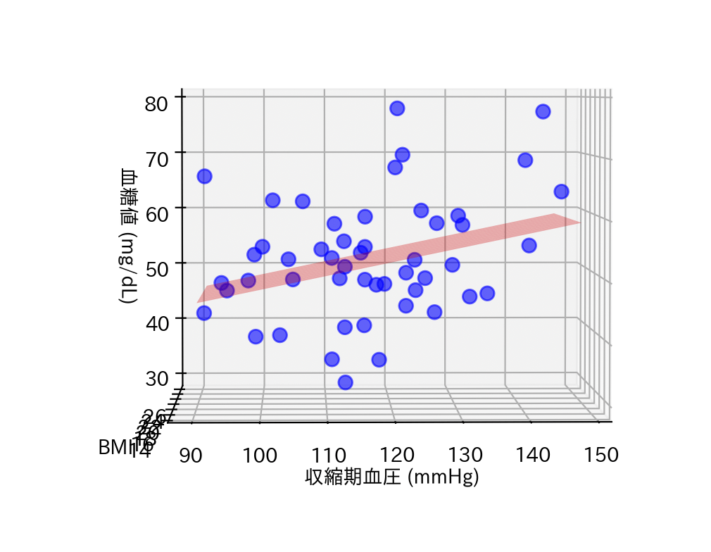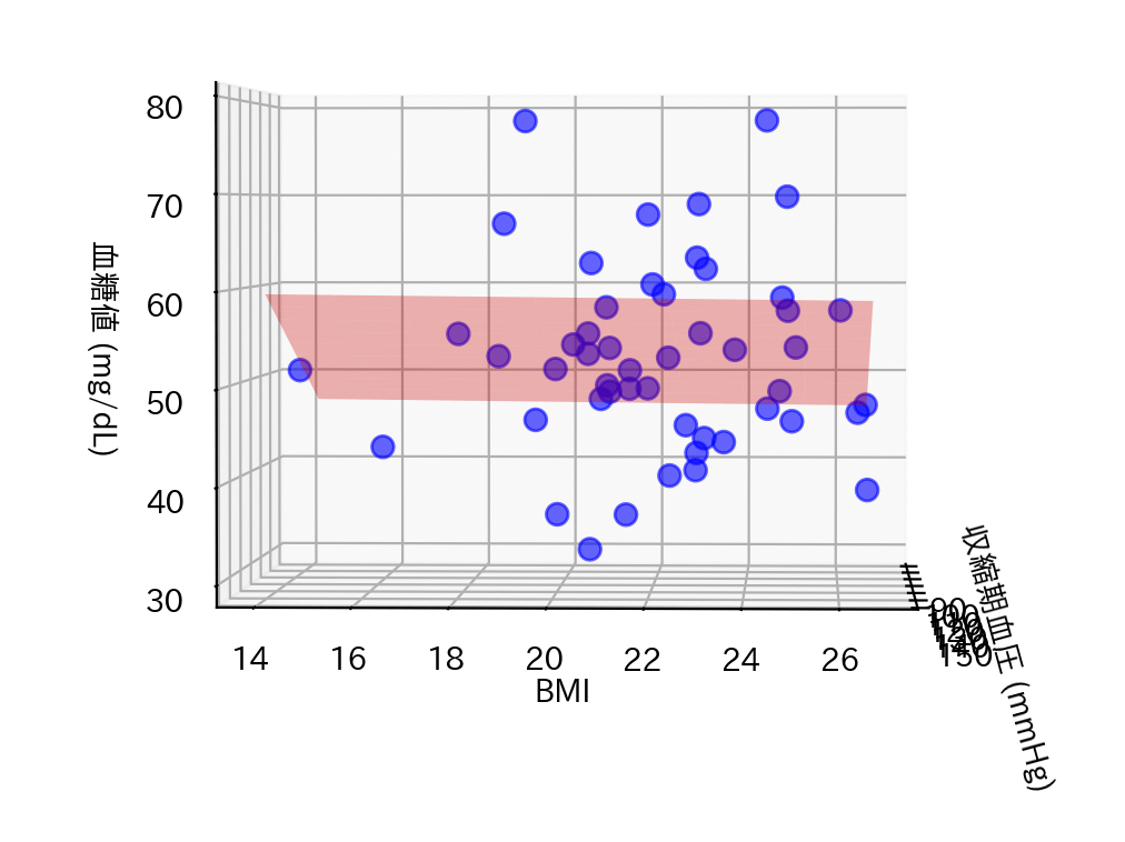 赤の平面は、空腹時血糖と収縮期血圧・BMIの関係を示しています。